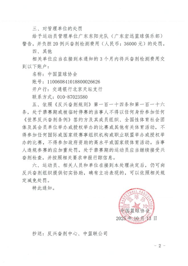 中国篮协在给广东东阳光队(广东宏远篮球俱乐部)下发的通知中说:“在国家体育总局反兴奋剂中心于2025年4月16日实施的赛内(2024-2025赛季CBA)兴奋剂检查中,你单位男子篮球运动员Troy Akeem Gillenwater(吉伦沃特)的A样本尿样检测结果呈大麻酚类(羧基四氢大麻酚)阳性。接到阳性通知后,运动员放弃检测B样本,因此该运动员检测结果阳性成立,表明运动员曾使用禁用物质或禁用方法,构成兴奋剂违规。运动员对该阳性作出了解释说明,并提供了证据材料。运动员能够证明在赛外摄入、使用禁用物质,并且与运动能力无关。接到兴奋剂违规通知后,运动员在规定时间内签署了结果管理回执单,承认兴奋剂违规,接受通知中指控的后果。”