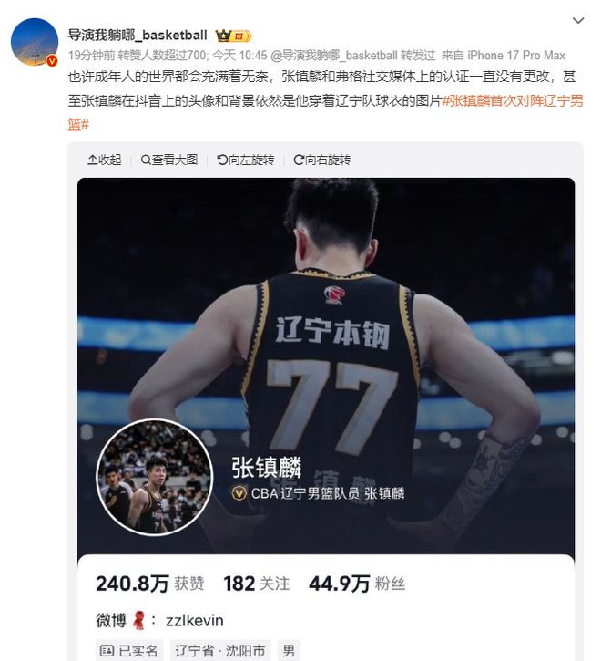 辽宁媒体人导演晒出张镇麟社媒的注册信息,张镇麟一直都没有更改认证,甚至在DY的头像、背景都还是辽宁男篮的球衣。