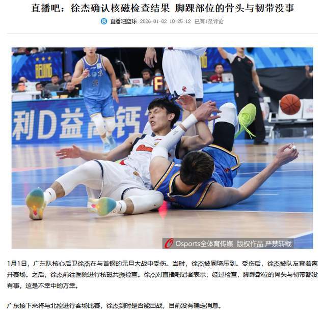 北京时间1月2日上午10点,广东男篮核心后卫徐杰的伤情又有了新的跟进。根据直播吧报道,徐杰亲自确认伤情,脚踝部位的骨头与韧带都没有事。看起来,这是不幸中的万幸,但是,对于广东队主帅杜锋来说,却遇上了新麻烦。接下来客战北控队的比赛,广东队恐怕要吞下连败了。