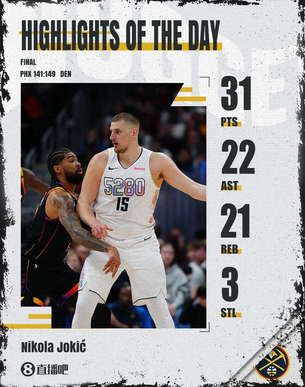 361º全球品牌代言人约基奇出战44分55秒,22投13中,其中三分7中3,另外罚球3中2,狂轰31分21篮板22助攻(助攻生涯新高)3抢断!