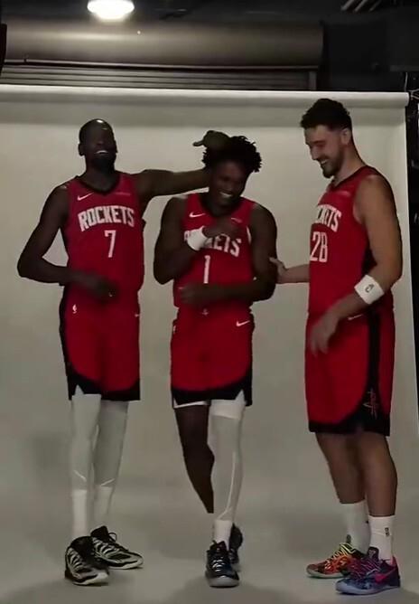 不久前有媒体上传视频,画面是火箭队拍摄定妆照。杜兰特和申京先出现在镜头中,随后阿门跑了过来。三人先是打闹一番,杜兰特和申京将阿门推到C位拍照。