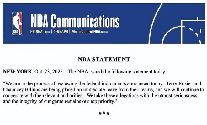 在发布会召开后不久,NBA官方就比卢普斯、罗齐尔被FBI逮捕一事发布官方声明,勒令两人立即从所属球队离职,“我们正在对今日公布的联邦起诉书进行回应。比卢普斯与罗齐尔即日起被要求离队暂停职务,我们将继续配合相关当局调查。我们以最严肃的态度对待这些指控,维护比赛公正性始终是我们的首要任务。”