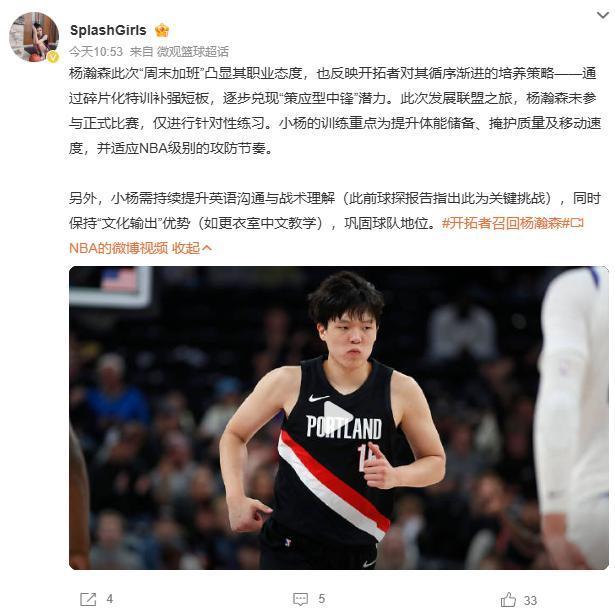 杨瀚森若想真正在波特兰站稳脚跟,就必须用实际表现为自己正名,至少要让所有人看到他不可替代的作用。
