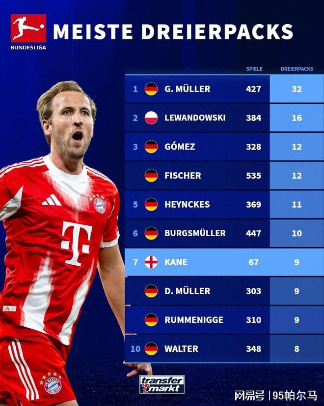 对标姆巴佩,参照梅西,32岁的凯恩并没有辜负“大英帝星”的头衔,以至于两届德甲金靴的履历并不能完全匹配星光,或者说他在德甲真正意义上实现了降维打击。比如他只用了67场比赛就完成了9次帽子戏法,他只用了104场就完成拜仁百球里程碑,并成为21世纪最快为五大联赛俱乐部打进百球的球员。