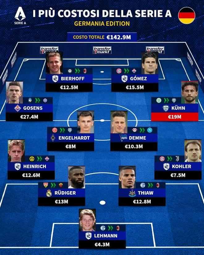 转会市场网统计了德国球员转会至意甲俱乐部身价最高榜单,总身价为1.429亿欧元,其中科莫前锋尼古拉斯-库恩成为第11位上榜球员。德国球员转会意甲球队价格最高阵容:门将:莱曼(430