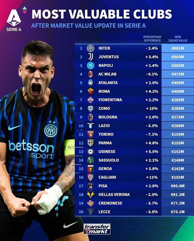 北京时间10月7日,在更新了意甲球员的身价之后,德转还列出了此次更新后意甲俱乐部总身价的涨幅情况以及具体排名,国际米兰以6.91亿欧元排名第一,随后分别是尤文图斯、那不勒斯以
