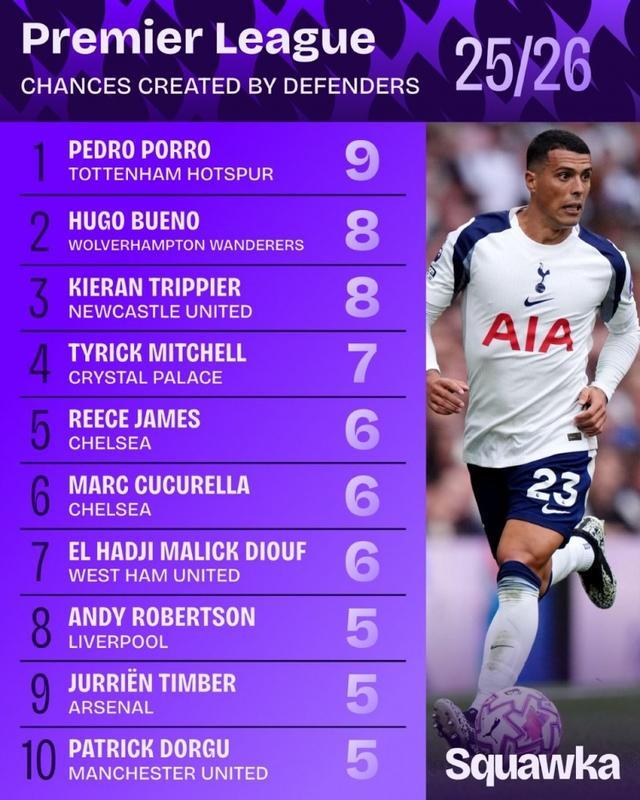 直播吧9月23日宣 日前,Squawka统计了本赛季英超后卫创造机会排行,热刺后卫波罗以9次居首。