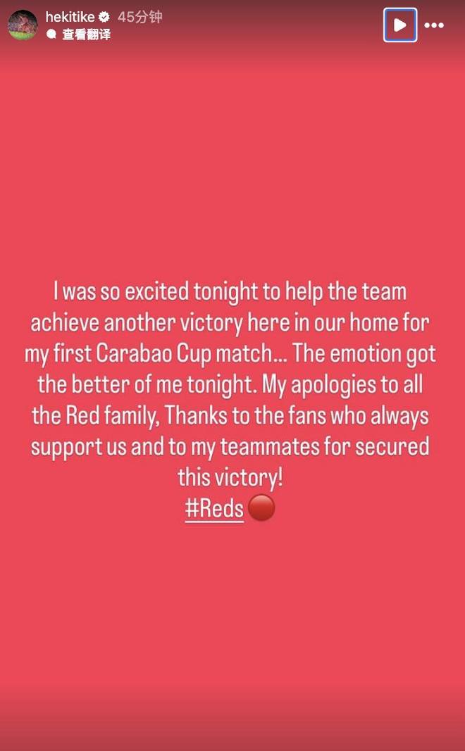 埃基蒂克随后在社交媒体发文道歉,他写道:“我今晚非常激动,能在主场帮助球队在我参加的第一场英联杯比赛中再获一场胜利……今晚的情绪让我有些失控,向所有红军家人道歉,感谢一直支持我们的球迷,也感谢我的队友们帮助我们赢得这场胜利!”