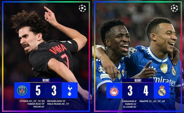 另一边,上赛季欧冠冠军巴黎迎战热刺。维蒂尼亚上演帽子戏法,法比安、帕乔和穆阿尼进球,里沙利松首开纪录和穆阿尼梅开二度,最终巴黎主场5-3取胜积12分排在第2,热刺积8分位列第16。