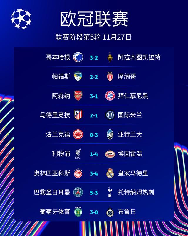 北京时间11月27日凌晨,25-26赛季欧冠联赛阶段第5轮,成功上演多场精彩较量。