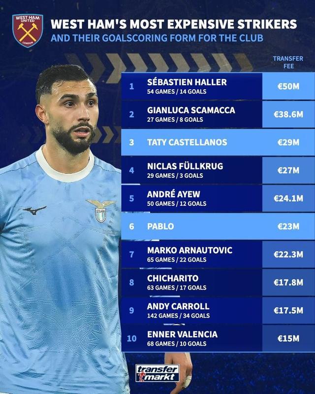 德转统计了西汉姆联队史引进花费最多的十名锋线球员,其中,阿莱以5000万欧元的转会费排名榜首,斯卡马卡第二,今年冬窗加盟球队的卡斯特利亚诺斯、巴勃罗分列第三、第六位。西汉姆