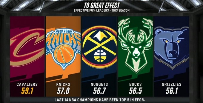 值得一提的是,最近14个NBA总冠军,他们的有效命中率都在联盟前五。