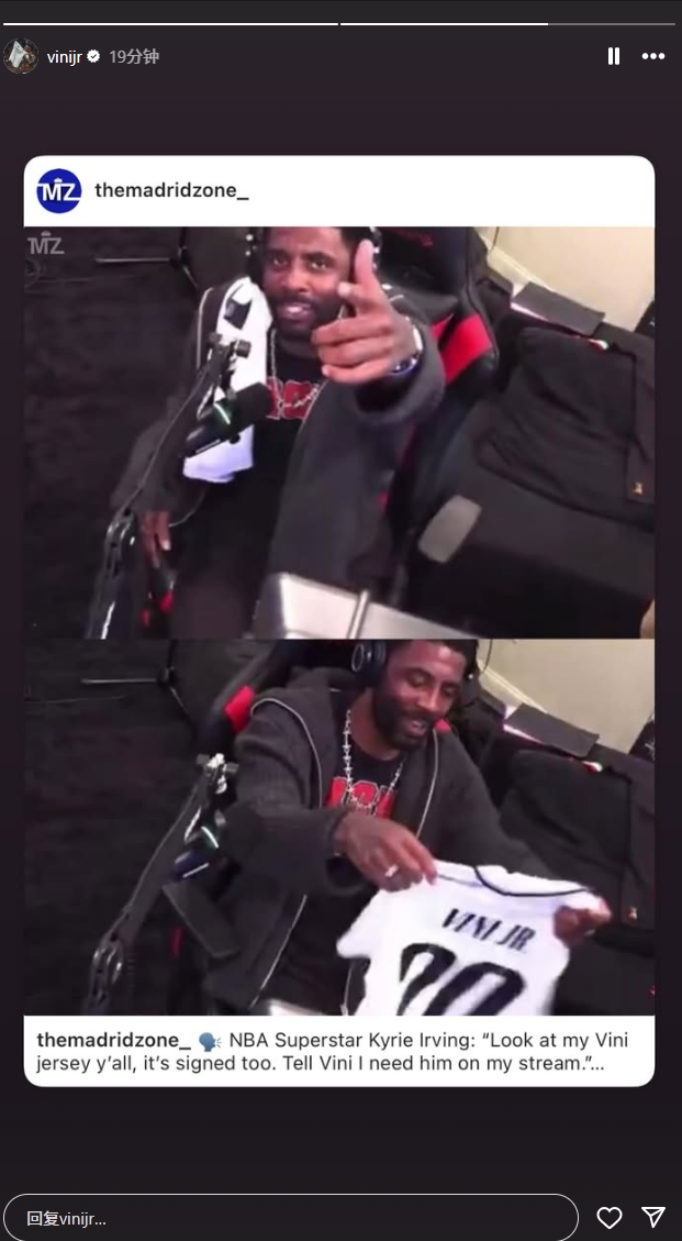 维尼修斯社媒截图03月24日报道 NBA球星凯里欧文近日开启直播,期间他为维尼修斯发声。欧文晒出了维尼修斯的签名球衣,表示:“你们看看我的维尼修斯球衣,这是签了名的。告诉他我需